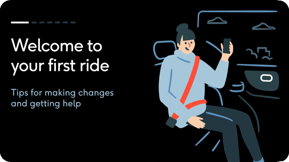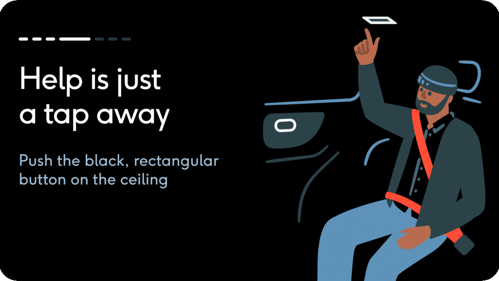 Personal tablets, one for each user, are attached to the ceiling to guide new users on their first ride. Because this is a very new experience for many people, a special step-by-step guide was made for first-time users. I helped animate and/or illustrate these screens.